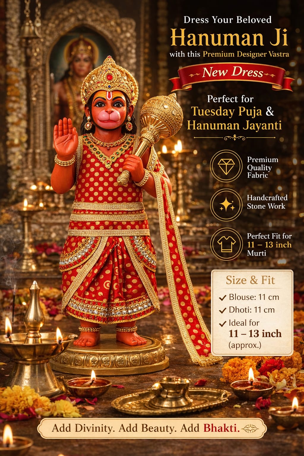 This designer vastra is thoughtfully created for 11–13 inch idols, ensuring a perfect and comfortable fit. The vibrant red and golden color combination symbolizes शक्ति (strength), भक्ति (devotion), and protection, making it ideal for Tuesday पूजा, Hanuman Jayanti, and daily worship rituals. The soft and durable material ensures long-lasting use while maintaining its rich appearance over time.